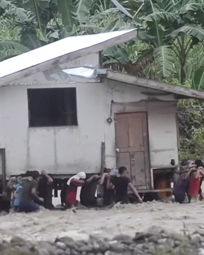በዚህ ሁሉ መሃል በርከት ያሉ ወጣቶች አንድ አነስ ያለች ቤትን ከስር መሰረቷ ተሸክመው በጎርፍ የተሞላ ወንዝን ሲያቋርጡ ታዩ።