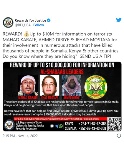 አሜሪካም የአልሸባብን መሪ “አሚር” አህመድ ዲሪዬ፣ ሁለተኛ አዛዥ የሆነውን ማሃድ ካራቴ እና ጄሃድ ሙስፋፋን ጨምሮ በቡድኑ የተለያየ ሚና ያላቸው የአሜሪካ ዜጋ የሆኑ አሸባሪዎችን ለጠቆመኝ ለእያንዳንዳቸው 10 ሚሊዮን ዶላር ወሮታ ለመክፈል ተዘጋጅቻለው ብላለች።