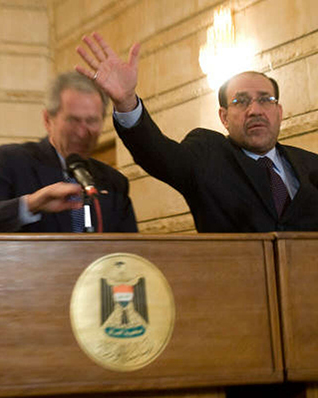 በባግዳድ ከኢራቅ ጠቅላይ ሚኒስትር ኑሪ አል ማሊኪ ጋር የተገናኙት ቡሽ፣ ከጠቅላይ ሚኒስትሩ ጋር የጋራ ጋዜጣዊ መግለጫ እየሰጡም ነበር። ጆርጅ ቡሽ በመግለጫው ኢራቅን የደበደብነው ለዓለም ሰላም አስፈላጊ ስለነበር ነው ብለው መከራከራቸው አልቀረም።